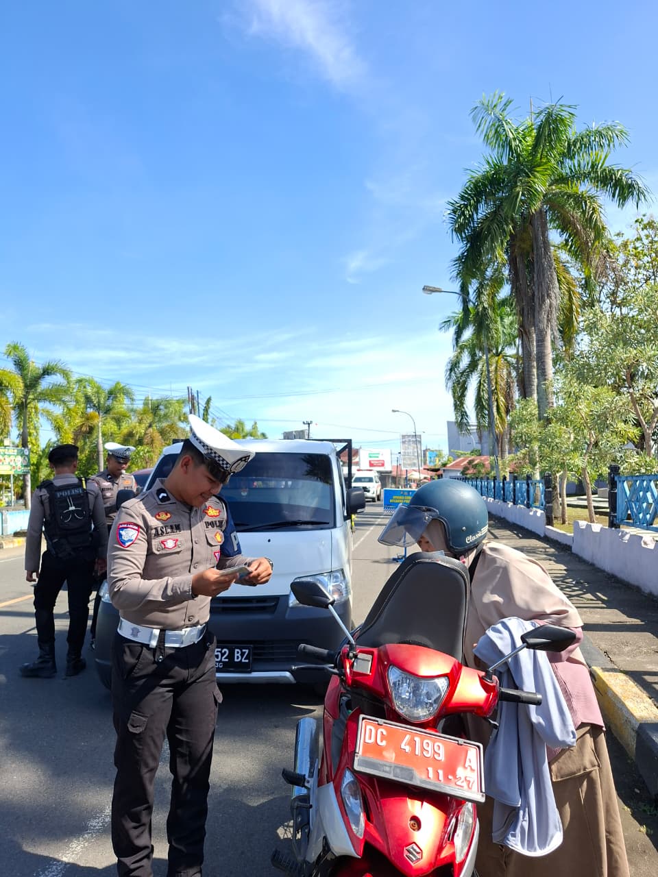 Setiap pengendara yang melintas diberhentikan untuk dilakukan pemeriksaan. Dengan pendekatan humanis dan komunikasi yang hangat, petugas memberikan edukasi terkait pentingnya keselamatan berkendara, mulai dari penggunaan helm dan sabuk pengaman hingga kelengkapan administrasi kendaraan.