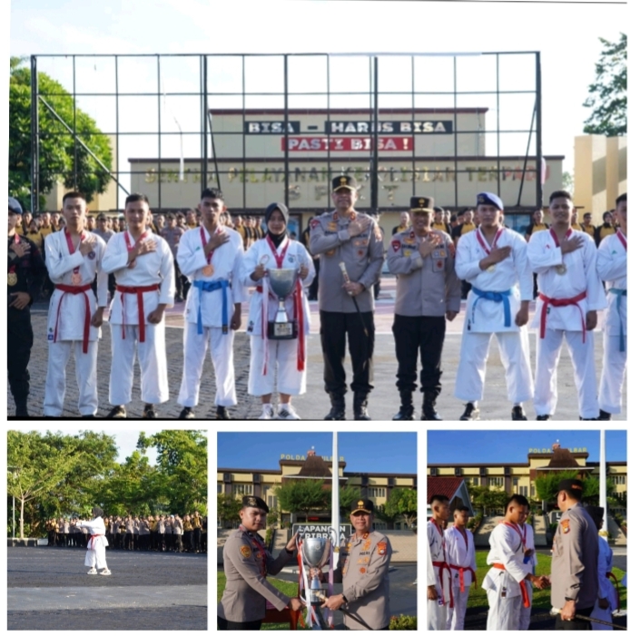 Sebagai bentuk penghargaan, Kapolda secara simbolis menyerahkan piala juara umum kepada tim karate dan memberikan pesan motivasi.