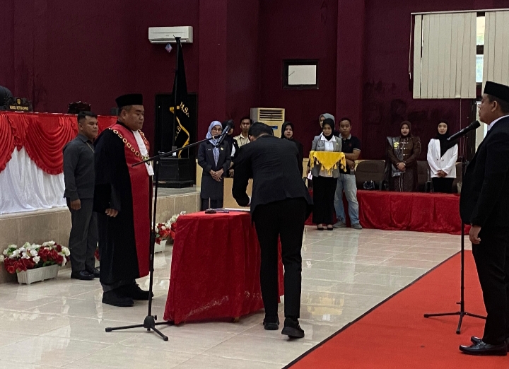 Dalam prosesi tersebut, Muhammad Dasri berdiri tegap di depan mimbar utama ruang sidang dengan mengenakan setelan jas hitam dipadukan dasi biru dan peci hitam. Di hadapannya telah disiapkan mikrofon untuk membacakan sumpah jabatan.
