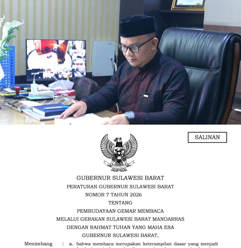 MAMUJU,NEWSPAS.NET– Pemerintah Provinsi Sulawesi Barat (Pemprov Sulbar) resmi menetapkan Peraturan Gubernur Sulawesi Barat Nomor 7 Tahun 2026 tentang Pembudayaan Gemar Membaca melalui Gerakan Sulawesi Barat Mandarras sebagai langkah strategis dalam meningkatkan kualitas sumber daya manusia dan memperkuat budaya literasi di daerah. Peraturan ini ditetapkan oleh Gubernur Sulbar Suhardi Duka (SDK) pada 10 Maret 2026 di Mamuju.