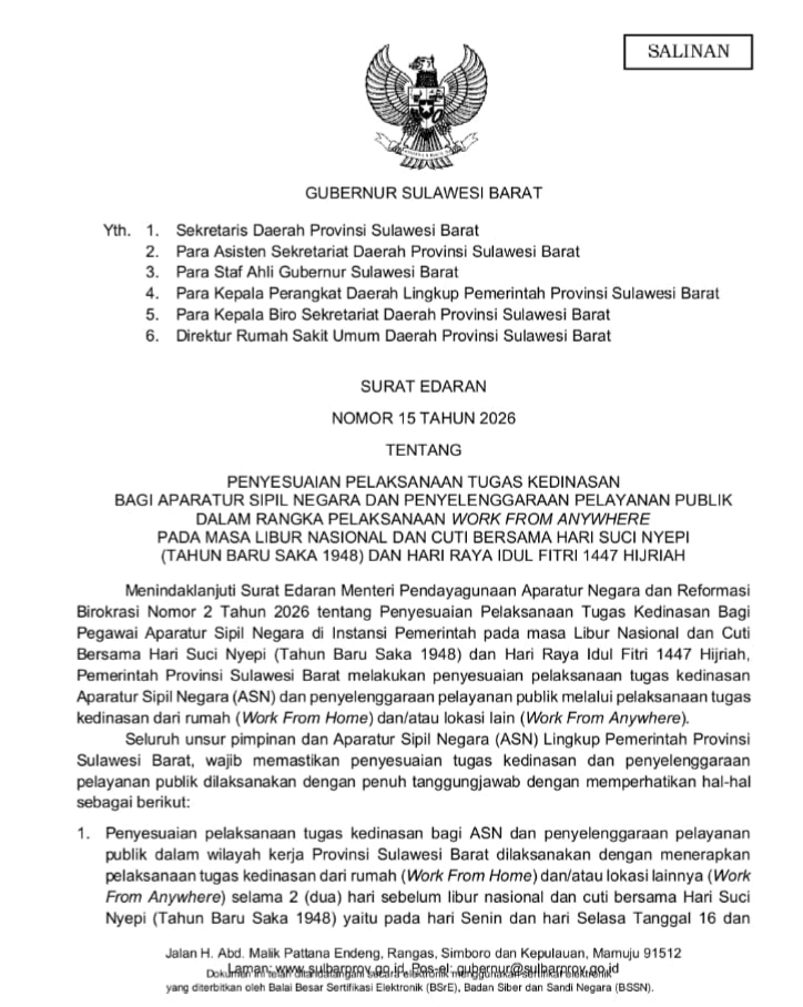 MAMUJU,NEWSPAS.NET – Pemerintah Provinsi Sulawesi Barat menerapkan penyesuaian pelaksanaan tugas kedinasan bagi Aparatur Sipil Negara (ASN) melalui kebijakan Work From Home (WFH) dan Work From Anywhere (WFA) menjelang libur nasional dan cuti bersama Hari Suci Nyepi Tahun Baru Saka 1948 serta Hari Raya Idul Fitri 1447 Hijriah.