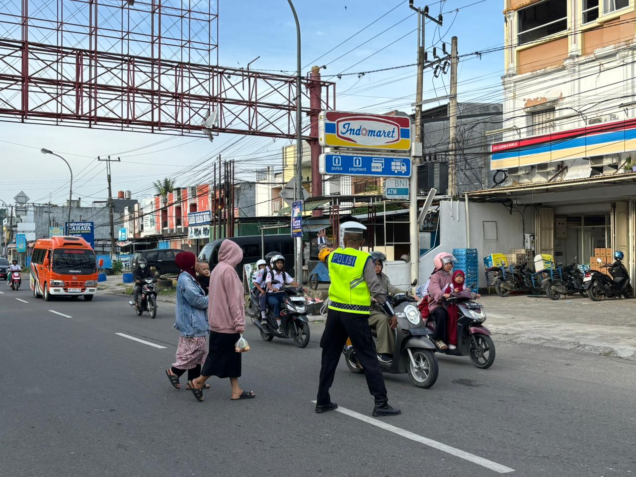 Tak hanya fokus pada kendaraan, Iptu Rahim juga dengan cepat membantu para pejalan kaki yang hendak menyeberang jalan, guna memastikan keselamatan dan kenyamanan seluruh pengguna jalan tanpa terkecuali.