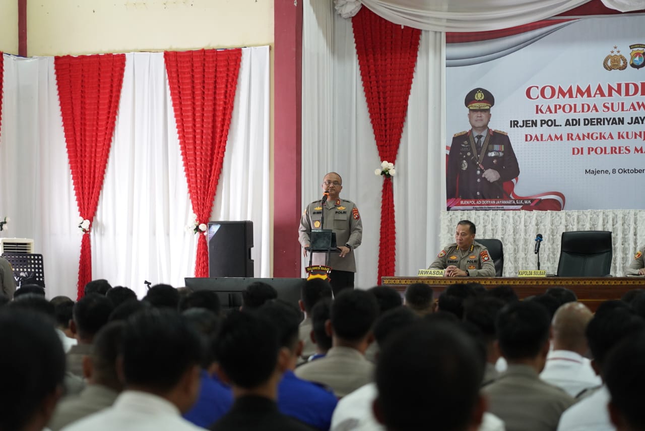 POLDA SULBAR,NEWSPAS.NET– Kapolda Sulawesi Barat, Irjen Pol Adi Deriyan Jayamarta, dalam rangkaian kunjungan kerjanya ke Polres Majene, Rabu (8/10/25) di Aula Mapolres. Dalam kunjungan tersebut, Kapolda memberikan arahan penting kepada seluruh personel Polres Majene.
