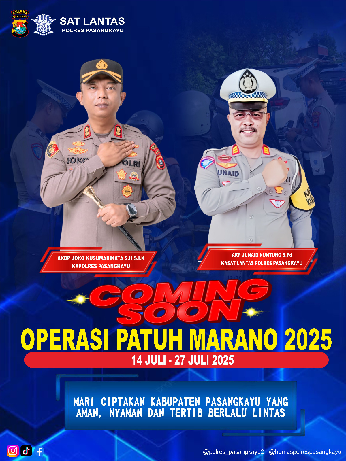 Kapolres Pasangkayu, AKBP Joko Kusumadinata, S.H., S.I.K., bersama Kasat Lantas AKP Junaid Nuntung, S.Pd., mengimbau seluruh masyarakat Pasangkayu agar senantiasa tertib dan patuh terhadap aturan berlalu lintas demi menciptakan situasi yang aman, nyaman, dan tertib di jalan raya.