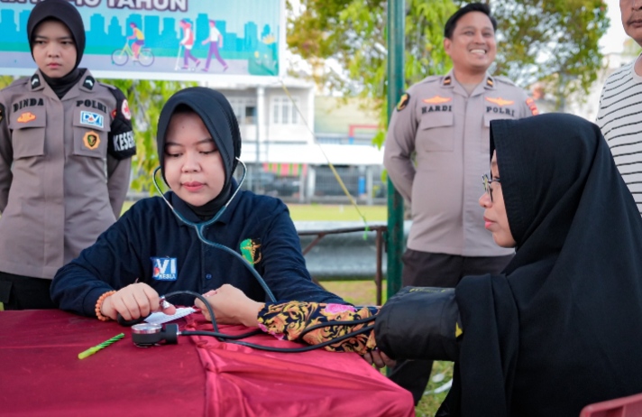 Petugas dari Bidang Kesehatan (Dokkes) Polri bersiaga penuh memberikan layanan pemeriksaan kesehatan gratis bagi masyarakat yang hadir. Layanan ini disambut antusias warga yang ingin memantau kondisi kesehatan mereka secara rutin.