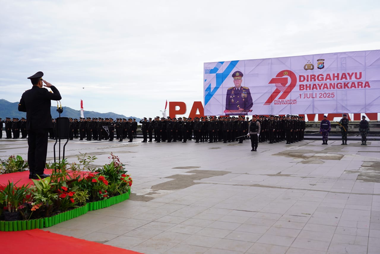 POLDA SULBAR, NEWSPAS.NET– Upacara puncak peringatan Hari Bhayangkara ke-79 di Sulawesi Barat berlangsung meriah di Anjungan Pantai Manakarra, Selasa (1/7/25). Ratusan pasang mata terpesona menyaksikan kegagahan TNI/Polri dalam upacara yang dipenuhi semangat kebangsaan. Suasana semakin semarak dengan penampilan senam Mapali yang memukau, dibawakan oleh Bhayangkari dan personel Brimob Polda Sulbar.