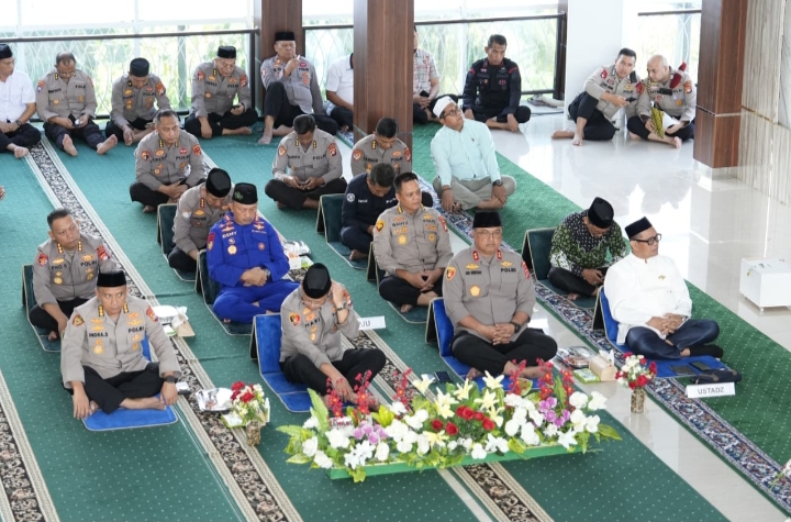 Acara yang berlangsung khidmat ini dihadiri langsung oleh Kapolda Sulbar, Irjen Pol Adi Deriyan Jayamarta bersama Kakanwil, para pejabat utama Mapolda, seluruh personel, serta anggota Bhayangkari. Suasana semakin syahdu dengan penampilan Marawis dan pembacaan sari tilawah oleh personel Polda Sulbar.