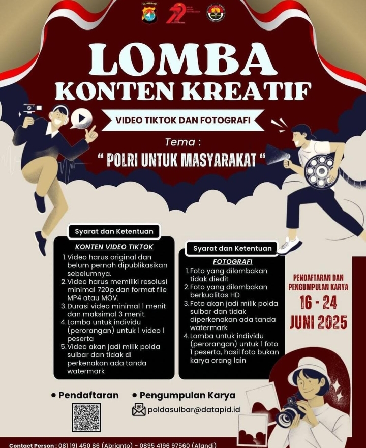 POLDA SULBAR, NEWSPAS.NET- Menjelang Hari Bhayangkara ke-79, Kepolisian Daerah Sulawesi Barat (Polda Sulbar) mengajak masyarakat untuk berpartisipasi dalam lomba konten kreatif dengan hadiah jutaan rupiah! Lomba ini terbuka untuk umum dan menawarkan kesempatan bagi warga negara Indonesia untuk mengekspresikan kreativitas mereka melalui video TikTok dan fotografi.