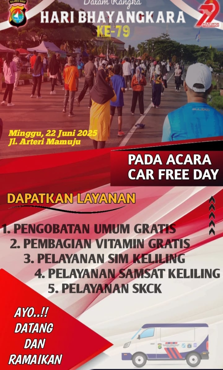 POLDA SULBAR, NEWSPAS.NET – Dalam rangka memeriahkan Hari Bhayangkara ke-79, Kepolisian Daerah Sulawesi Barat (Polda Sulbar) akan menghadirkan berbagai layanan gratis untuk masyarakat pada kegiatan Car Free Day (CFD) yang digelar di Jalan Arteri Mamuju, Minggu, 22 Juni 2025 mendatang.
