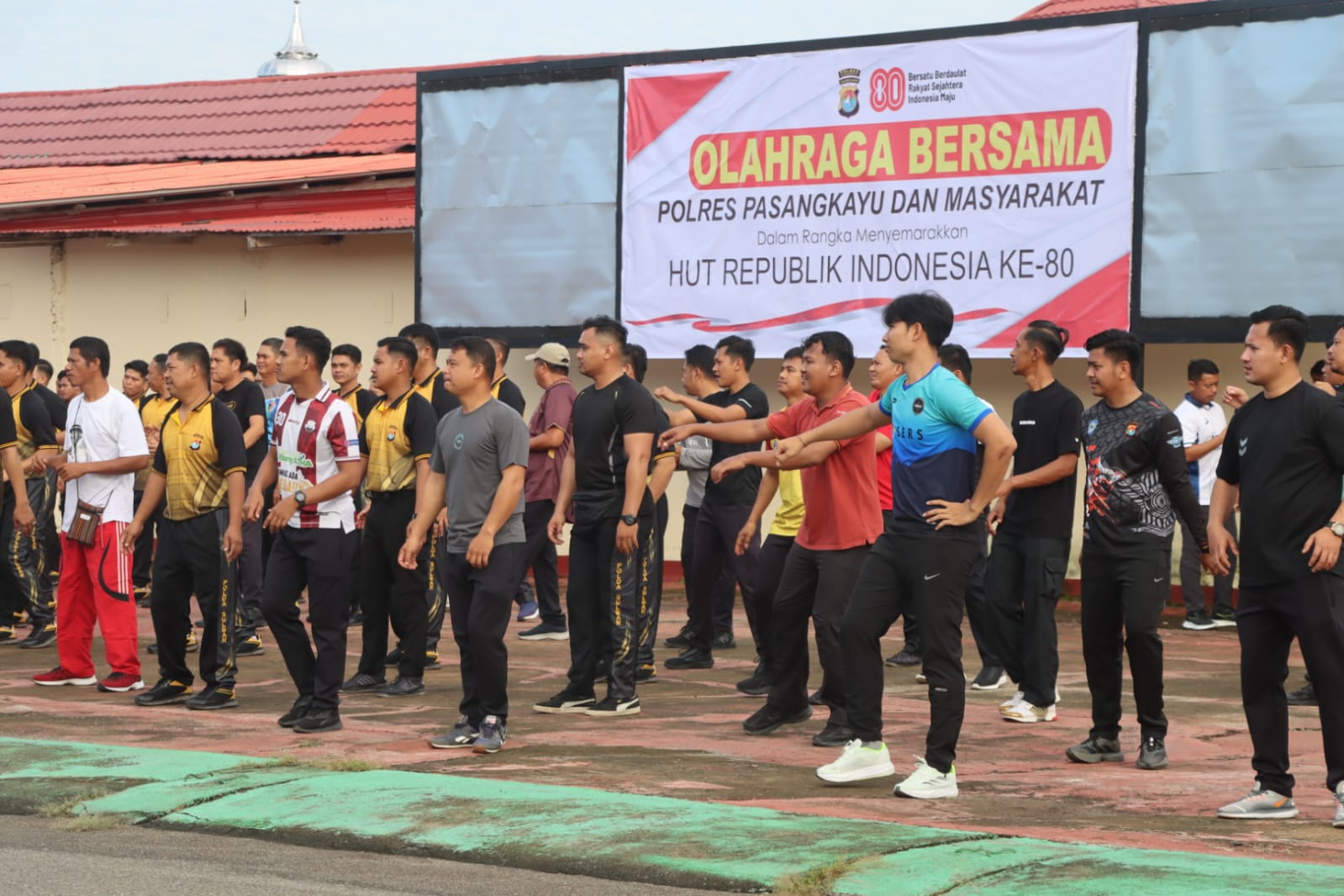 PASANGKAYU, NEWSPAS.NET – Dalam rangka memupuk persatuan dan kebersamaan, Polres Pasangkayu menggelar Olahraga Bersama dengan masyarakat, Jumat (15/8/2025) pukul 07.30 WITA di Lapangan Apel Corona, Polres Pasangkayu. Kegiatan ini menjadi bagian dari peringatan Hari Ulang Tahun ke-80 Republik Indonesia.
