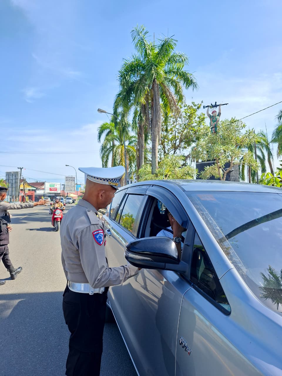 Setiap pengendara yang melintas terlihat diberhentikan untuk dilakukan pemeriksaan. Dengan pendekatan humanis serta komunikasi yang hangat, petugas memberikan edukasi terkait pentingnya keselamatan berkendara, mulai dari penggunaan helm dan sabuk pengaman hingga kelengkapan administrasi kendaraan.